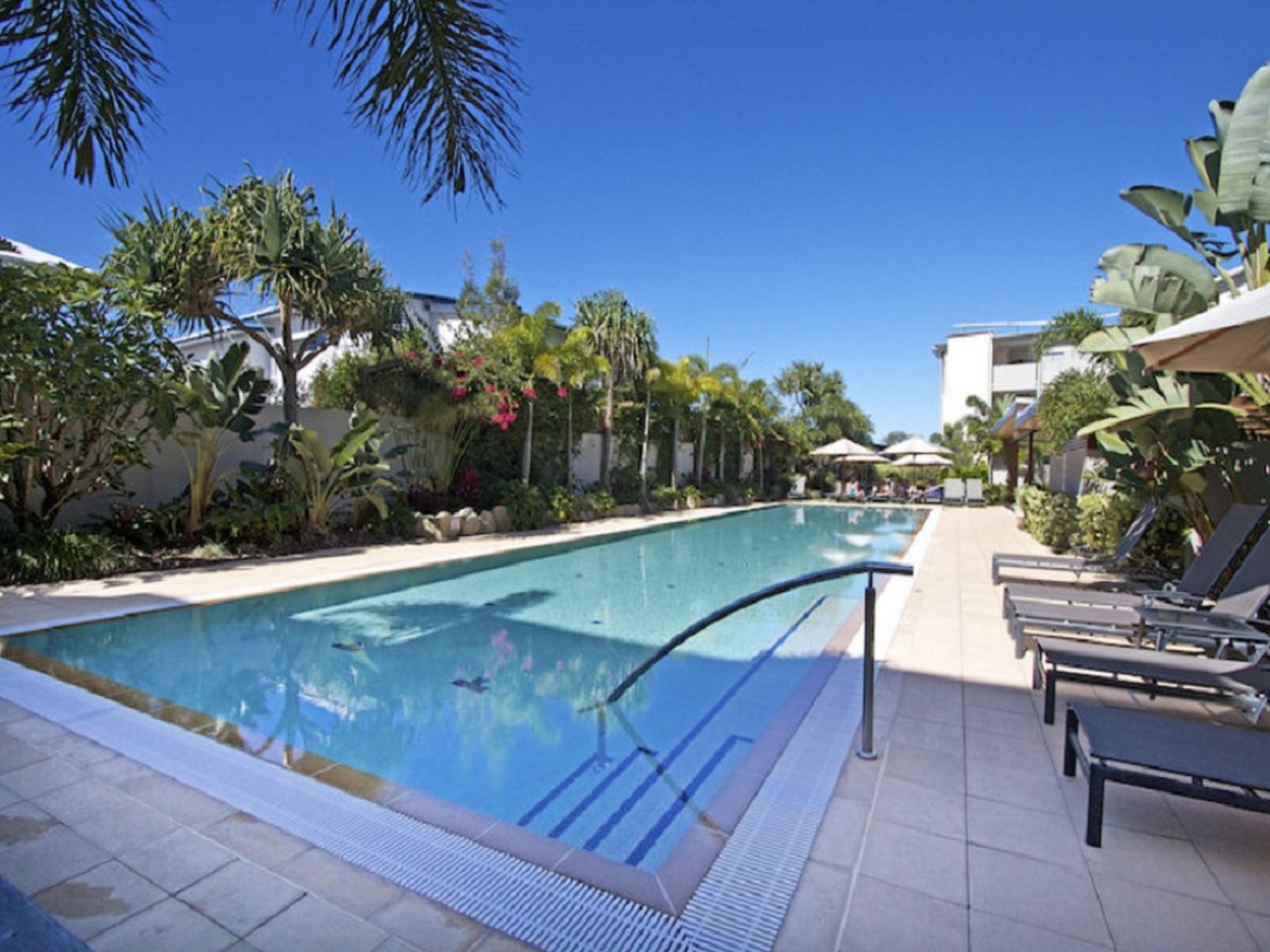 The apartment features a private balcony with outdoor dining space that overlooks the meticulously landscaped resort grounds. Its convenient ground-floor location provides seamless access to the resort's facilities, including a resort-style pool, heated spa, and pool terrace with sun loungers.