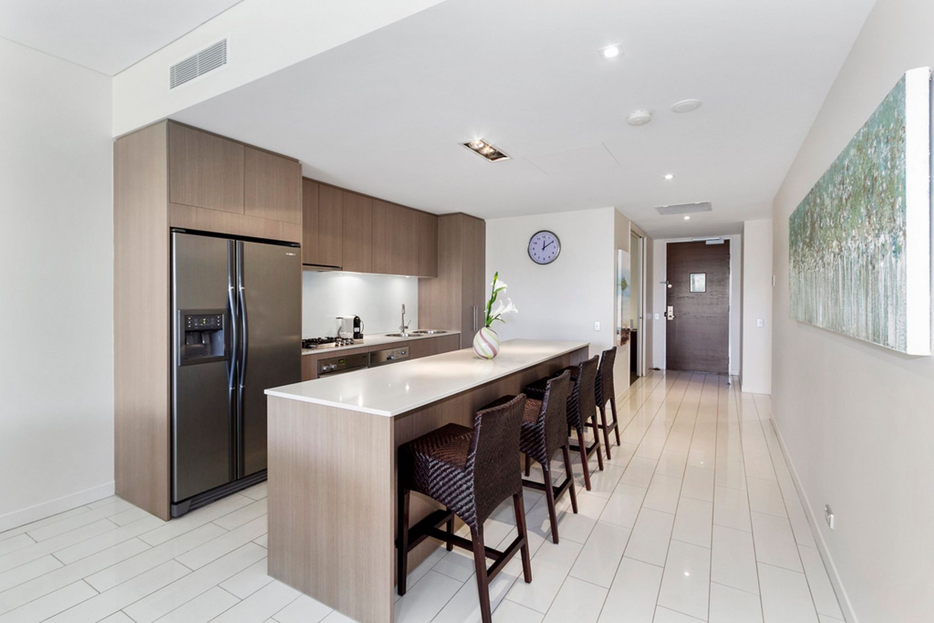 Inside, discover a thoughtfully designed open-plan living area anchored by a practical kitchen with a spacious island bench – perfect for casual brunches or creating family meals. The well-appointed kitchen comes equipped with quality appliances, including gas cooking facilities and a versatile convection microwave.