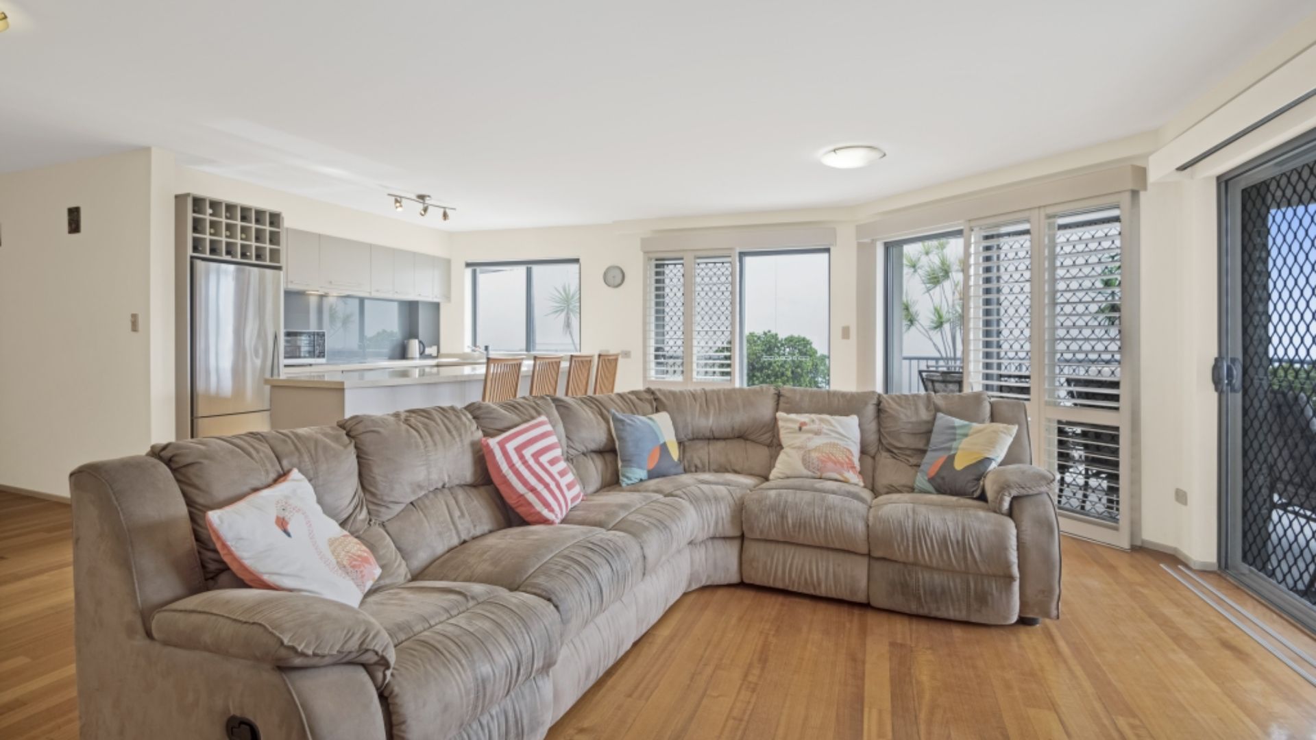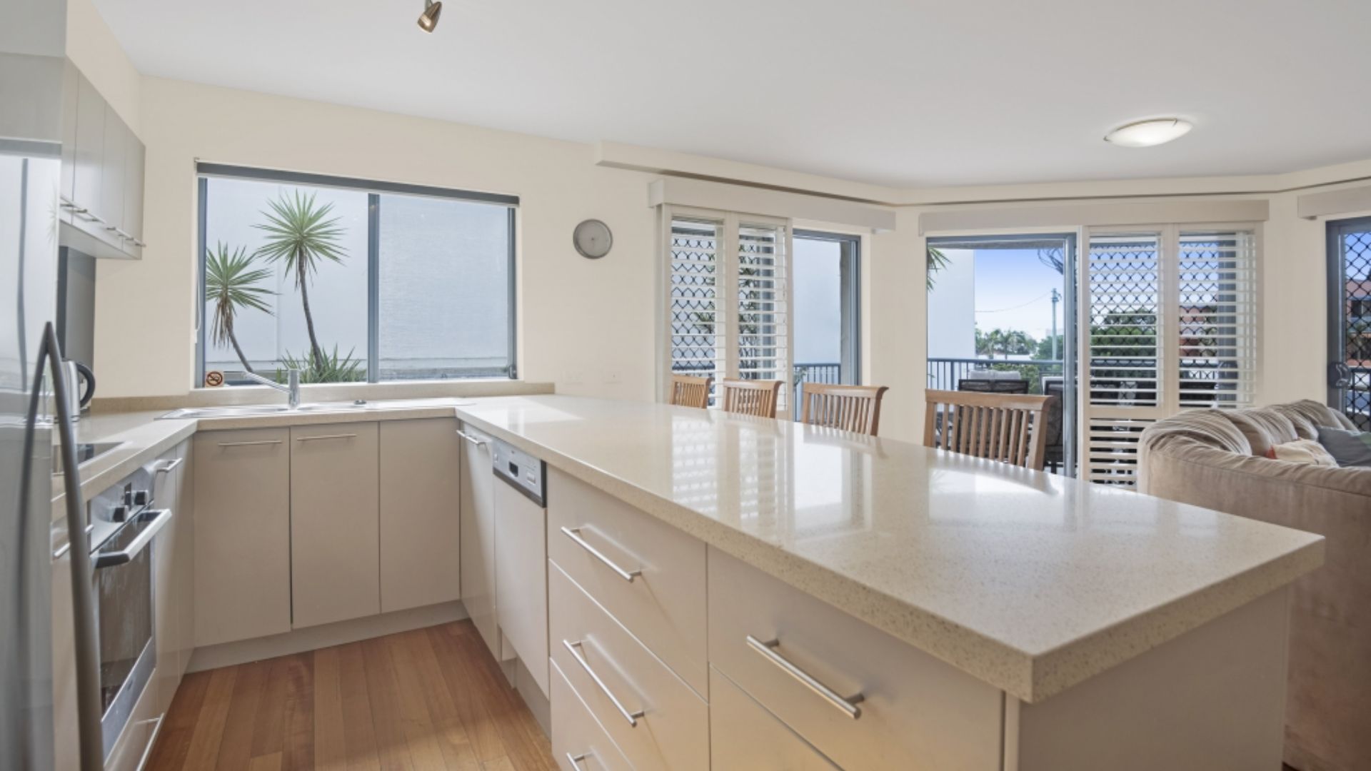 The apartment features elegant timber flooring throughout, with an open-plan living area that extends seamlessly to the generous balcony – the perfect spot to enjoy the BBQ facilities or relax while taking in the stunning ocean vistas. The sleek kitchen is equipped with quality stone benchtops and premium appliances including a dishwasher, making holiday meals a pleasure rather than a chore.