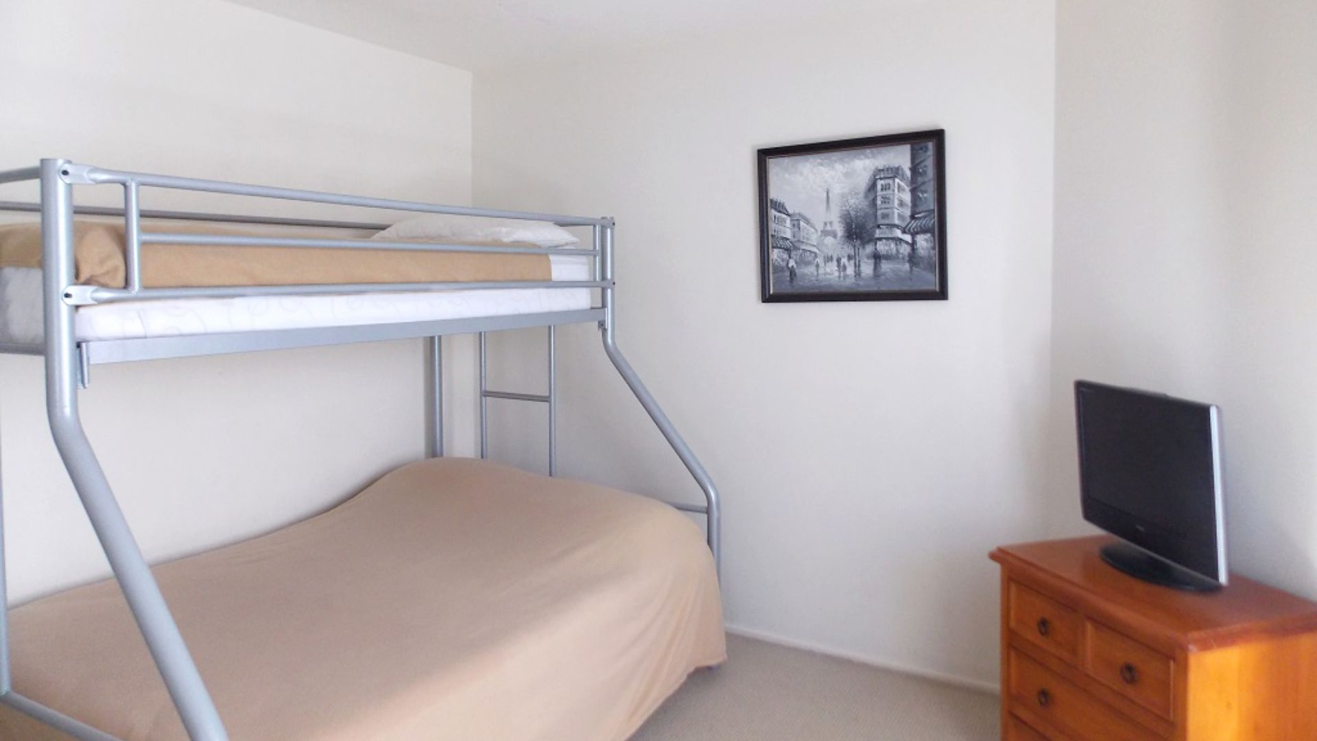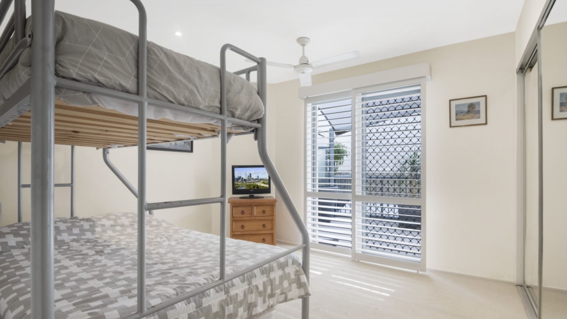 Rest comfortably in the master bedroom with its queen bed and private ensuite, while the second bedroom provides another queen bed for guests. The third bedroom features a practical double-and-single bunk arrangement, allowing the apartment to accommodate up to 7 guests with ease. Stay comfortable year-round with air conditioning in the main living space and ceiling fans in all bedrooms.