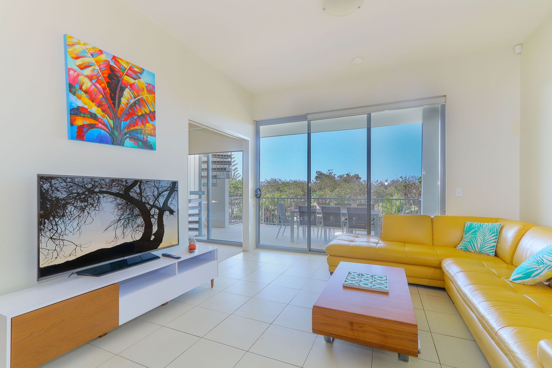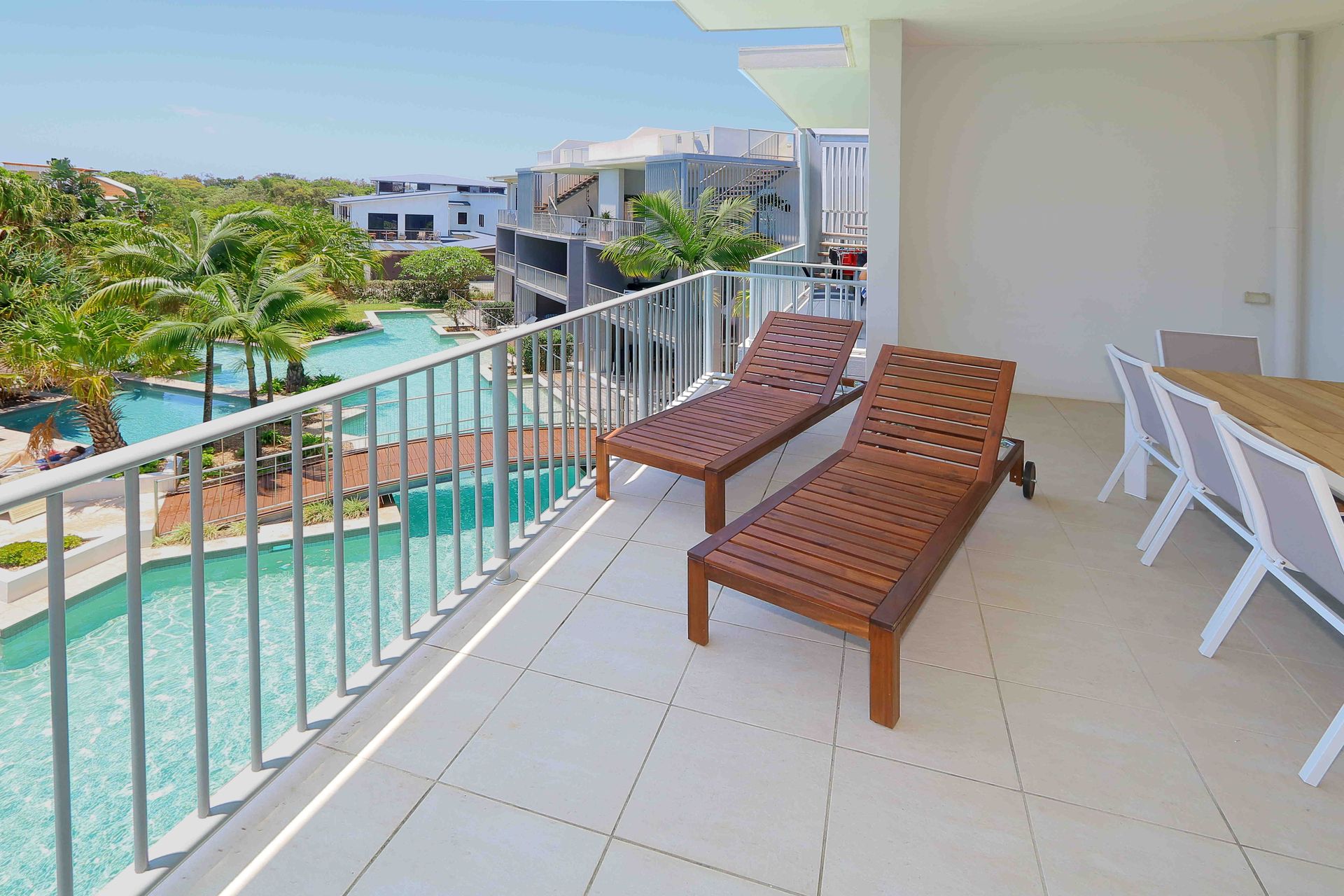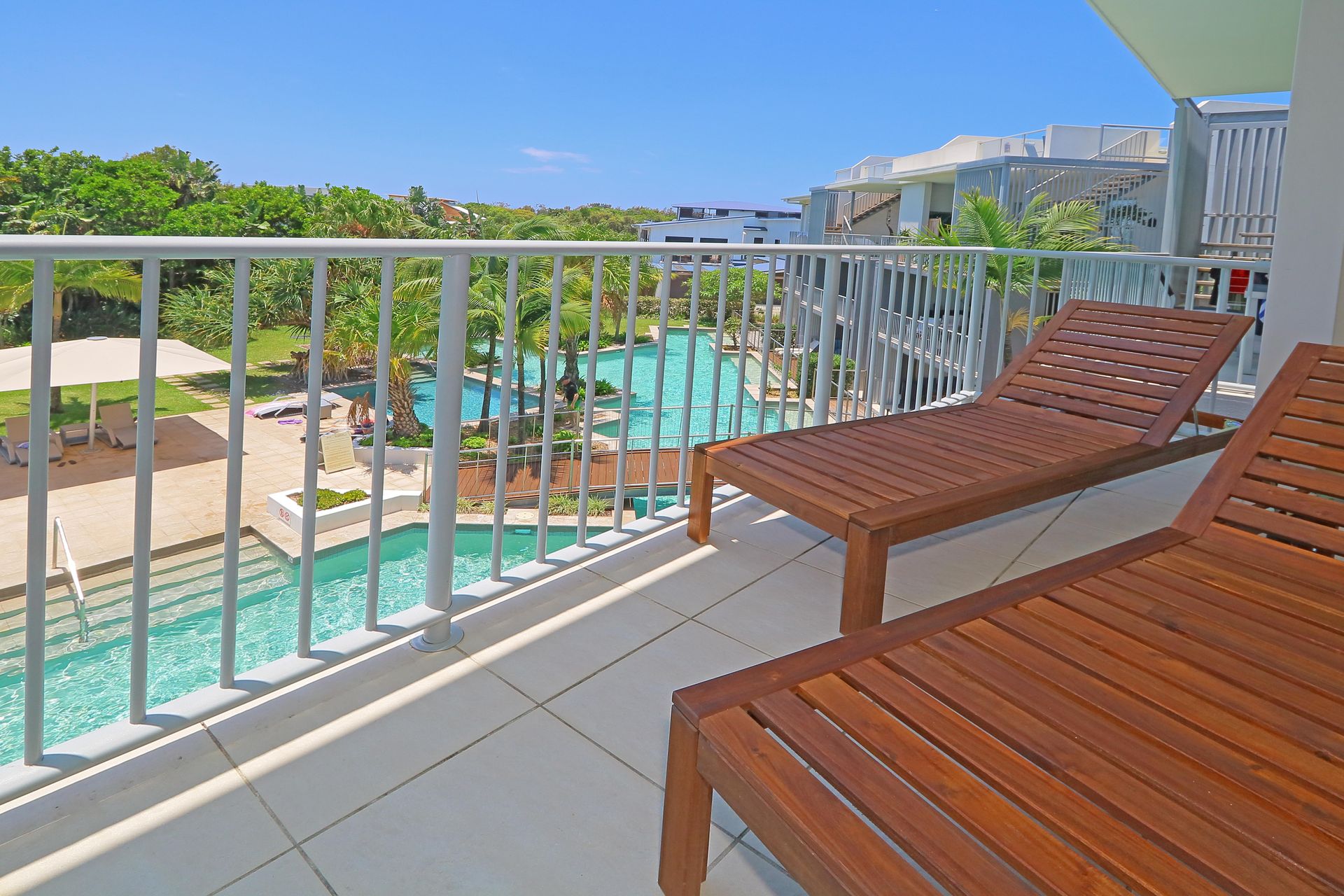 The balcony serves as an extension of the living space – ideal for morning coffees or evening drinks while overlooking the resort's pools. From this elevated position, you can appreciate the pleasant outlook and catch the coastal breeze.