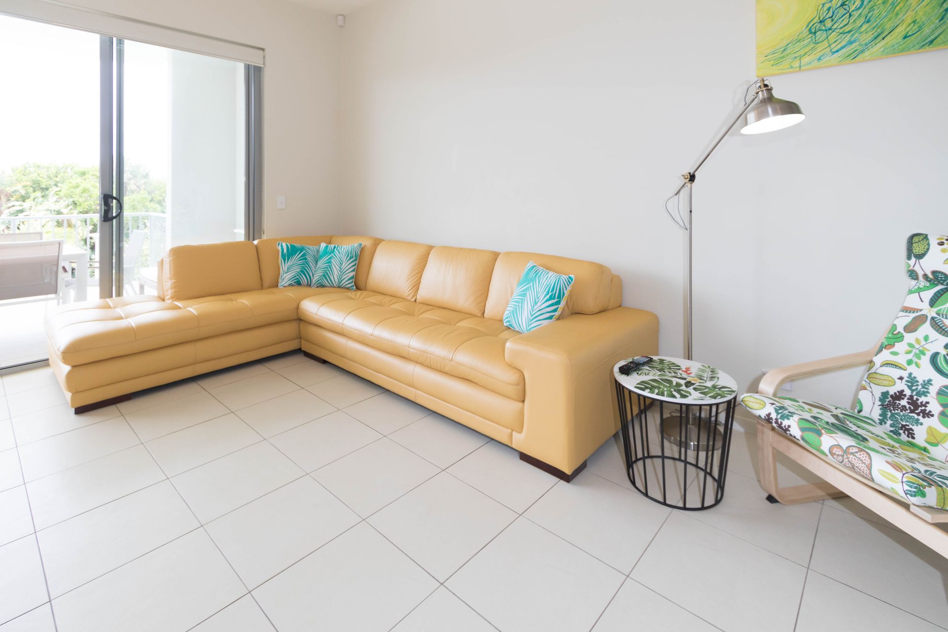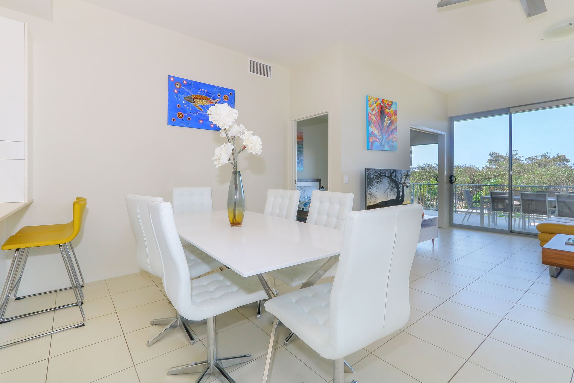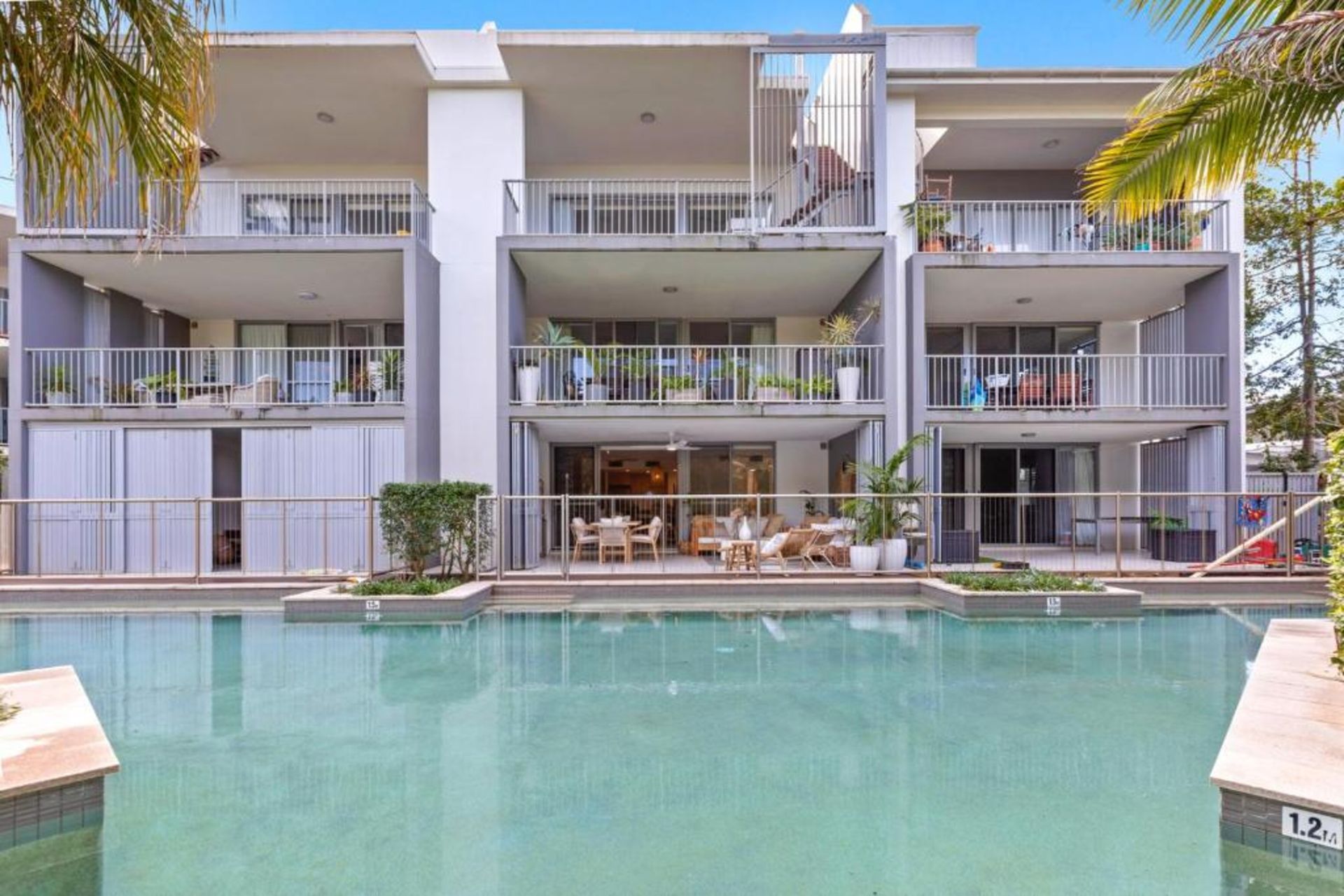 The balcony serves as an extension of the living space – ideal for morning coffees or evening drinks while overlooking the resort's pools. From this elevated position, you can appreciate the pleasant outlook and catch the coastal breeze.