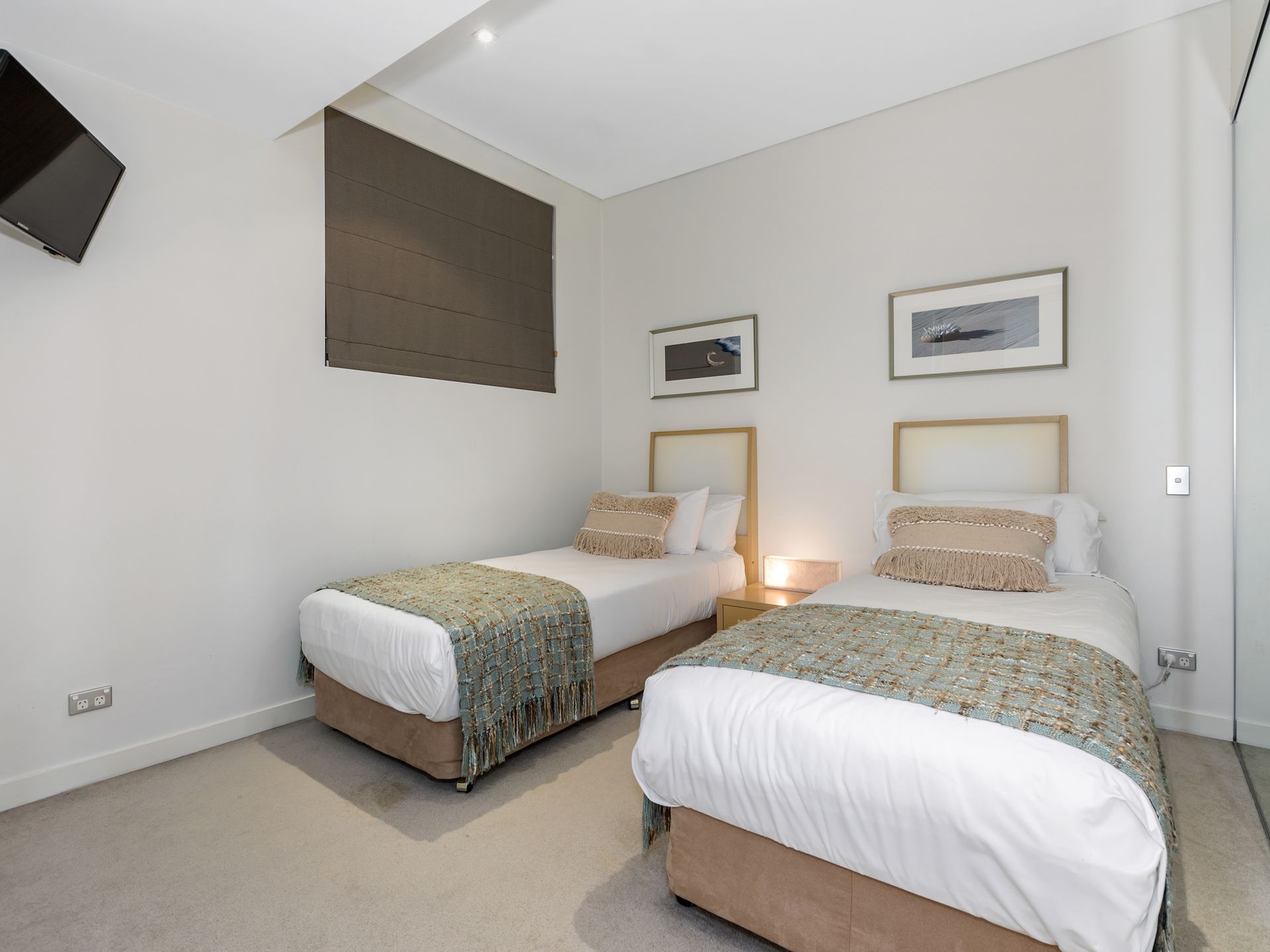 The thoughtfully designed interior features a chef-inspired kitchen with spacious island bench, excellent for casual meals or preparing family feasts. Three well-appointed bedrooms comprise two with king beds and a third with two king singles, comfortably housing up to 6 guests. The apartment also includes three stylish bathrooms and secure basement parking with lift access.